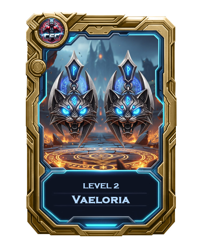 <table><thead><tr><th width="116" align="center">LVL</th><th align="center">Earring</th><th align="center">Upgrade Success Rates</th><th align="center">Level Drop Chance</th><th align="center">Burn Rate</th><th align="center">CFC Cost</th><th align="center">Power</th></tr></thead><tbody><tr><td align="center">Lv.1 </td><td align="center">Elyndra</td><td align="center">-</td><td align="center">-</td><td align="center">-</td><td align="center">-</td><td align="center">5</td></tr><tr><td align="center">Lv.1 → Lv.2</td><td align="center">Vaeloria</td><td align="center">🔶 75%</td><td align="center">⚠️ 15%</td><td align="center">🔥 10%</td><td align="center">100 CFC</td><td align="center">7</td></tr><tr><td align="center">Lv.2 → Lv.3</td><td align="center">Nytheris</td><td align="center">🔶 70%</td><td align="center">⚠️ 20%</td><td align="center">🔥 10%</td><td align="center">200 CFC</td><td align="center">11</td></tr><tr><td align="center">Lv.3 → Lv.4</td><td align="center">Zylarion</td><td align="center">🔶 65%</td><td align="center">⚠️ 25%</td><td align="center">🔥 10%</td><td align="center">400 CFC</td><td align="center">17</td></tr></tbody></table>