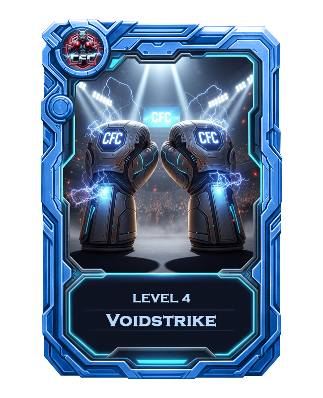<table><thead><tr><th width="116" align="center">LVL</th><th align="center">Glove</th><th align="center">Upgrade Success Rates</th><th align="center">Level Drop Chance</th><th align="center">Burn Rate</th><th align="center">CFC Cost</th><th align="center">Power</th></tr></thead><tbody><tr><td align="center">Lv.1 </td><td align="center">Shadowpaw</td><td align="center">-</td><td align="center">-</td><td align="center">-</td><td align="center">-</td><td align="center">5</td></tr><tr><td align="center">Lv.1 → Lv.2</td><td align="center">Stormfist</td><td align="center">🔶 75%</td><td align="center">⚠️ 15%</td><td align="center">🔥 10%</td><td align="center">100 CFC</td><td align="center">7</td></tr><tr><td align="center">Lv.2 → Lv.3</td><td align="center"> Eclipsegrasp</td><td align="center">🔶 70%</td><td align="center">⚠️ 20%</td><td align="center">🔥 10%</td><td align="center">200 CFC</td><td align="center">11</td></tr><tr><td align="center">Lv.3 → Lv.4</td><td align="center">Voidstrike</td><td align="center">🔶 65%</td><td align="center">⚠️ 25%</td><td align="center">🔥 10%</td><td align="center">400 CFC</td><td align="center">17</td></tr></tbody></table>