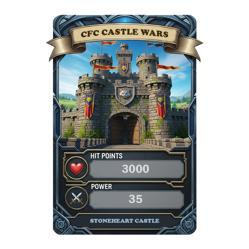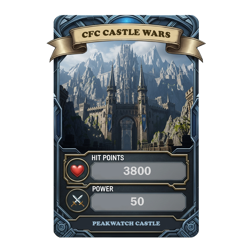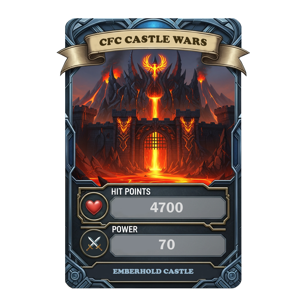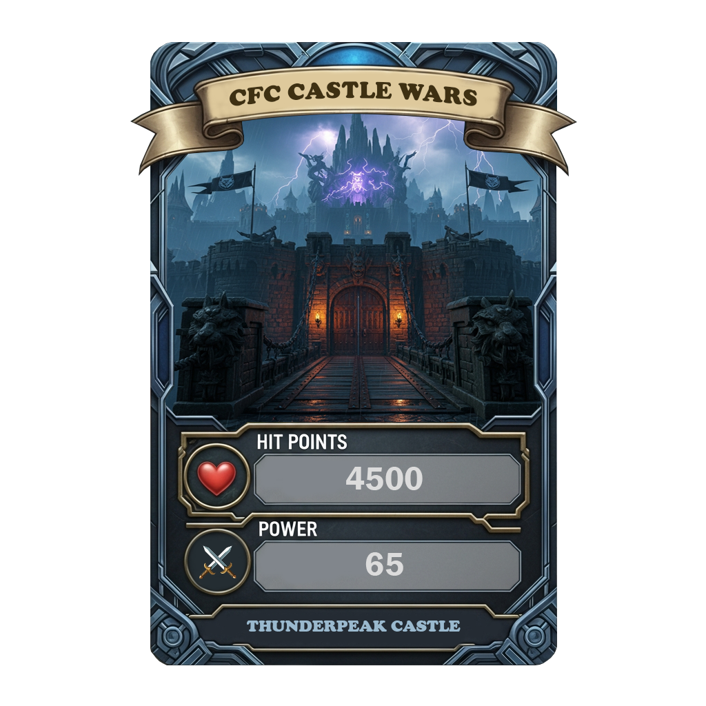 <div><figure><img src="https://3622004096-files.gitbook.io/~/files/v0/b/gitbook-x-prod.appspot.com/o/spaces%2FE2D40IyoFUDceCfyN5Aq%2Fuploads%2Fs0FDgdCcyxVSdxzo3myZ%2FStoneheart%20Castle.png?alt=media&#x26;token=ef2a81c7-1482-4b4c-ae43-c1c33db17d34" alt=""><figcaption><p>HP: 3000<br>POWER: 35 </p></figcaption></figure> <figure><img src="https://3622004096-files.gitbook.io/~/files/v0/b/gitbook-x-prod.appspot.com/o/spaces%2FE2D40IyoFUDceCfyN5Aq%2Fuploads%2Fenx3bU8zYlbu5ZMxWyqi%2FBloomspire%20Castle.png?alt=media&#x26;token=d6dec504-879e-4912-9f91-5010bcda0cb7" alt=""><figcaption><p>HP: 3400<br>POWER: 40</p></figcaption></figure> <figure><img src="https://3622004096-files.gitbook.io/~/files/v0/b/gitbook-x-prod.appspot.com/o/spaces%2FE2D40IyoFUDceCfyN5Aq%2Fuploads%2FQVjo77ZyMX1bxBdF08OY%2FPeakwatch%20Castle.png?alt=media&#x26;token=e6d60230-bda9-4f2e-9f90-111f7db049ad" alt=""><figcaption><p>HP: 3800<br>POWER: 50</p></figcaption></figure> <figure><img src="https://3622004096-files.gitbook.io/~/files/v0/b/gitbook-x-prod.appspot.com/o/spaces%2FE2D40IyoFUDceCfyN5Aq%2Fuploads%2FJKlEh7wPgUGJdwatLnj1%2FSky%20Castle.png?alt=media&#x26;token=cd653288-7fea-434e-9f85-04aff5774e36" alt=""><figcaption><p>HP: 4200<br>POWER: 60</p></figcaption></figure> <figure><img src="https://3622004096-files.gitbook.io/~/files/v0/b/gitbook-x-prod.appspot.com/o/spaces%2FE2D40IyoFUDceCfyN5Aq%2Fuploads%2F1afFd8q1AVeqKGvuw0kn%2FThunderpeak%20Castle.png?alt=media&#x26;token=7a313935-100e-4657-b297-1756d76015ba" alt=""><figcaption><p>HP: 4500<br>POWER: 65</p></figcaption></figure> <figure><img src="https://3622004096-files.gitbook.io/~/files/v0/b/gitbook-x-prod.appspot.com/o/spaces%2FE2D40IyoFUDceCfyN5Aq%2Fuploads%2Fd29nH2xWIXbKCrrO5T1T%2FEmberhold%20Castle.png?alt=media&#x26;token=ce860562-e705-4bd1-9af4-866602299190" alt=""><figcaption><p>HP: 4700<br>POWER: 70</p></figcaption></figure></div>
